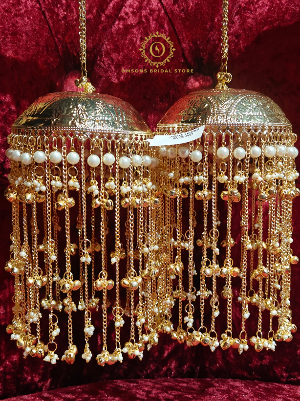 This Golden Bridal Kaleera is made with care and tradition. It has a beautiful round top design with hanging golden chains and white pearls that move softly and shine brightly.
