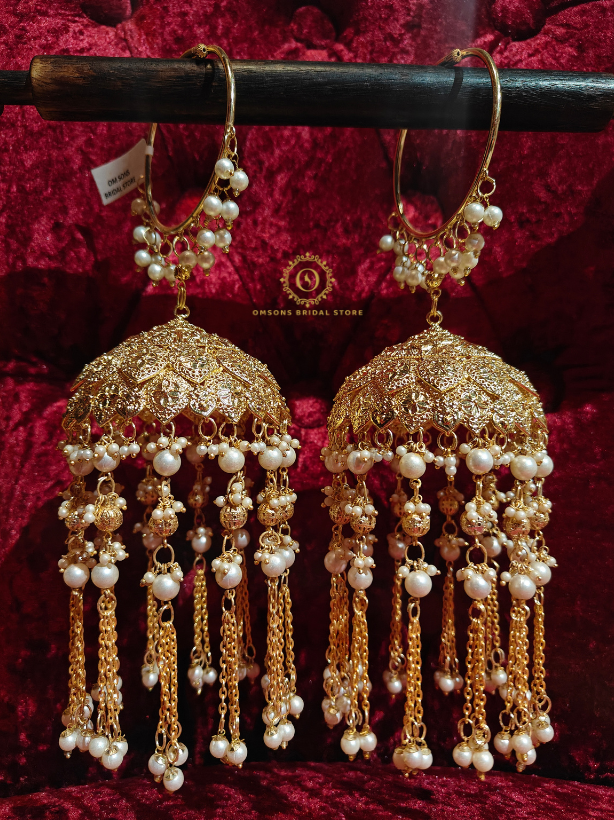 This Golden Pearl Bridal Kaleera is simple, elegant, and beautifully made. It has golden chains and white pearl hangings that move softly and shine nicely.