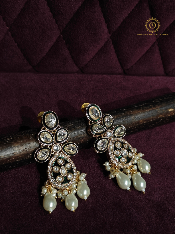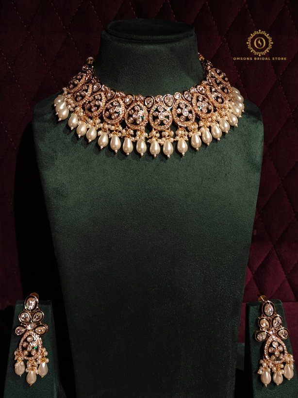 This beautiful kundan set comes with matching earrings. The choker has gold-finish detailing, sparkling kundan stones, and pearl drops that give it a rich and elegant look. It sits perfectly on the neck and adds a traditional touch to any outfit.