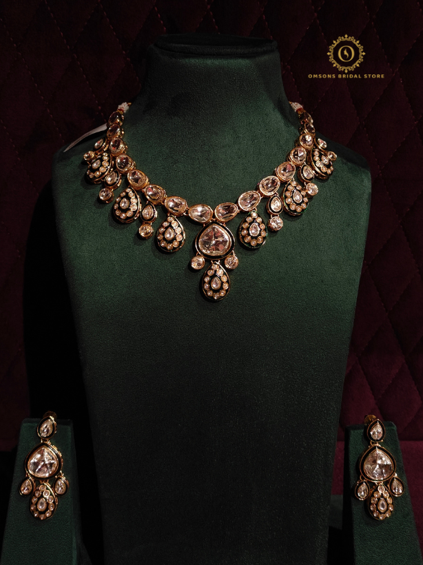 This Kundan Set is a beautiful jewellery set with shiny stones. The necklace has teardrop and round stones that look very elegant. It also comes with matching earrings.