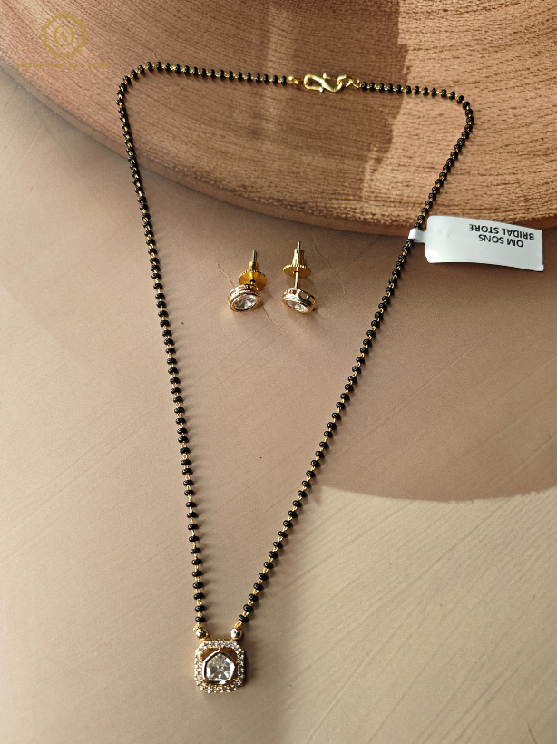 This daily wear mangalsutra features a neat black-bead chain with a square-shaped stone pendant that adds a soft sparkle. The matching stud earrings pair perfectly with the pendant, giving the set a clean and elegant look.