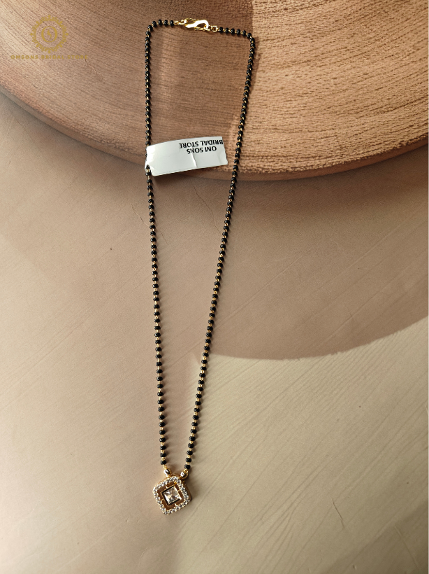 This beautiful mangalsutra set comes with a black-bead chain and a stylish square-shaped stone pendant. The pendant has a shiny finish that adds a neat sparkle to daily looks. The matching square stud earrings complete the set perfectly, giving it a clean and elegant style.
