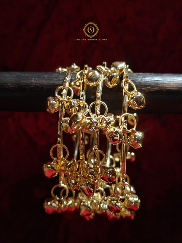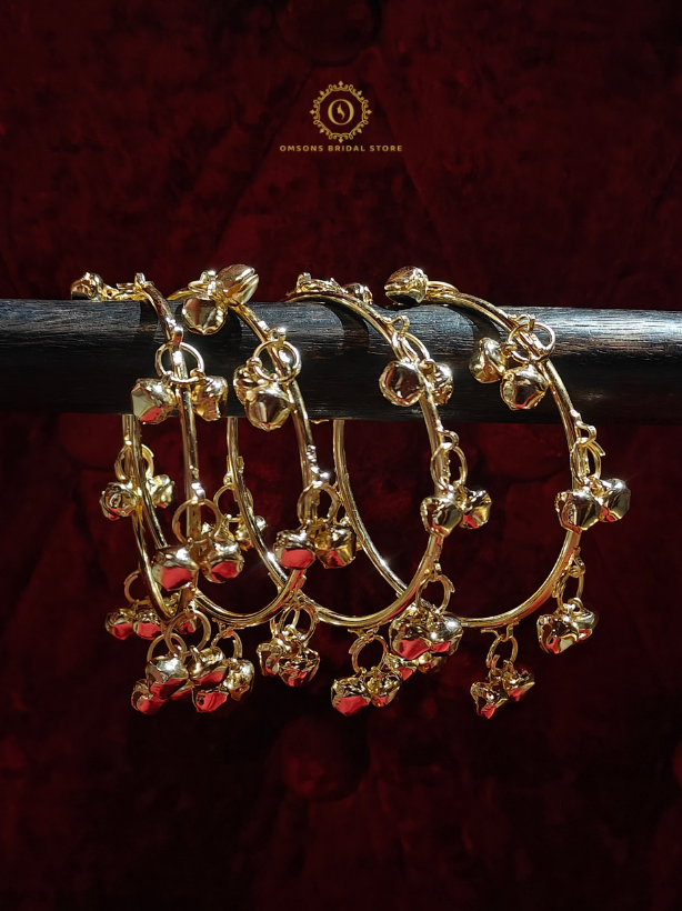 These are simple and shiny golden ghungroo bangles. The small ghungroos give a soft, pretty look and add a light sound when you move your hand. They match well with any outfit and can be worn daily or for small functions. The bangles are light in weight and very comfortable to wear.
