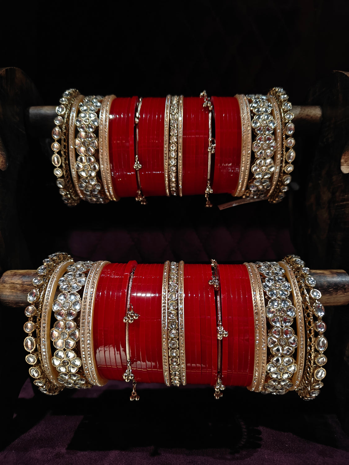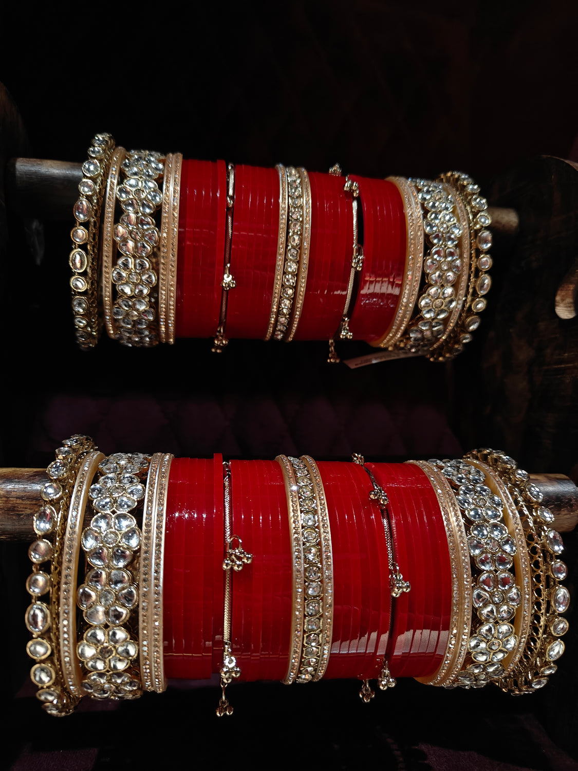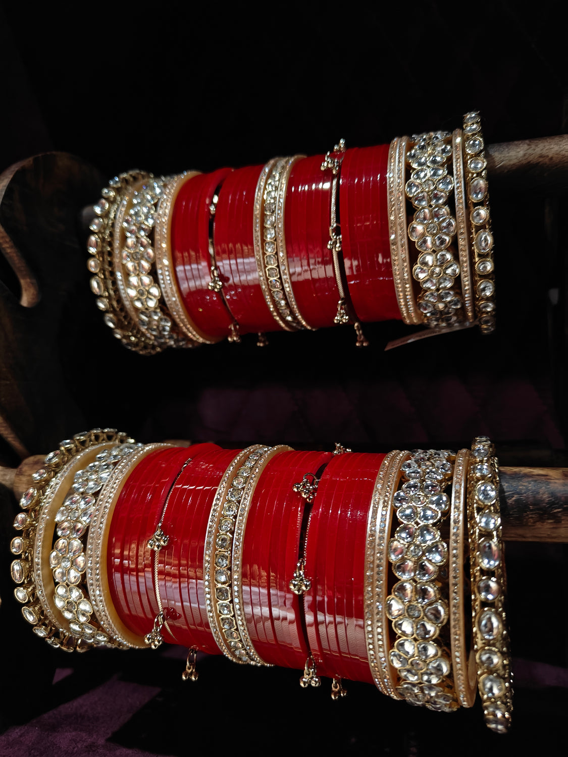 Kundan Chura embodies the essence of tradition and royal charm, crafted to enhance a bride’s beauty with elegance and timeless sophistication.